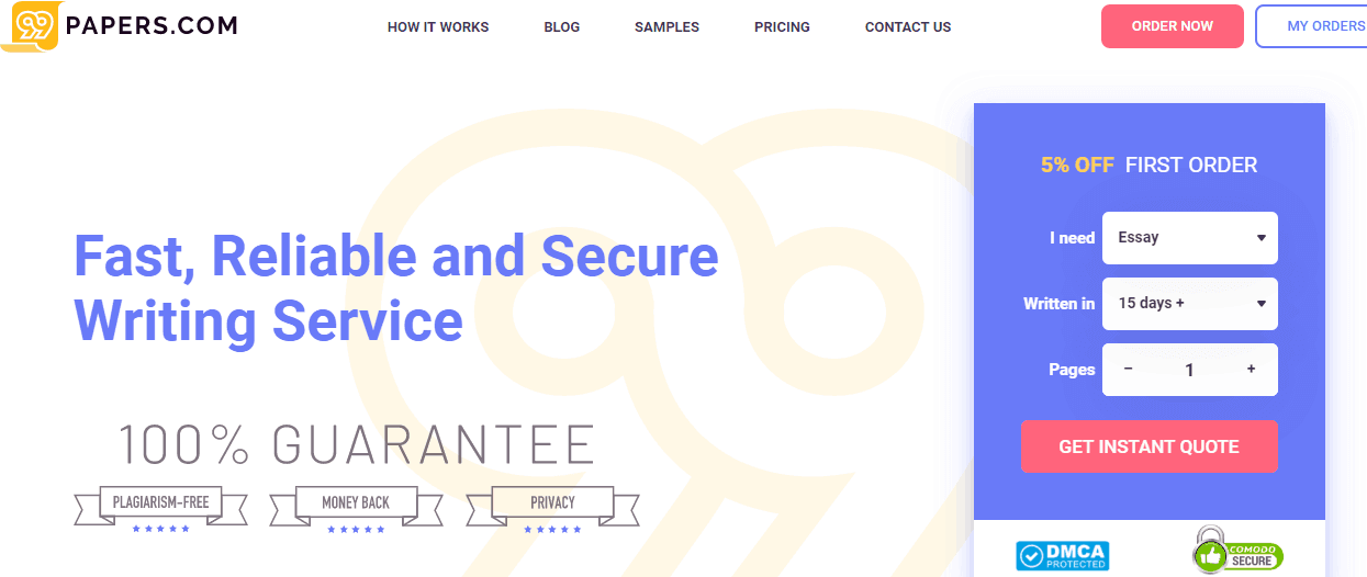 Like other services on our list, 99papers provides reliable writing services at academic levels ranging from high school to doctorate. One of the benefits of 99papers is its customizable order form. You can pick features that you need, which allows you to save some money. Besides, you get free things like a title page, outline, proofreading, revisions, etc. 99papers also has strong customer support that helps with any concerns or questions you may have regarding your order or the services of the company.