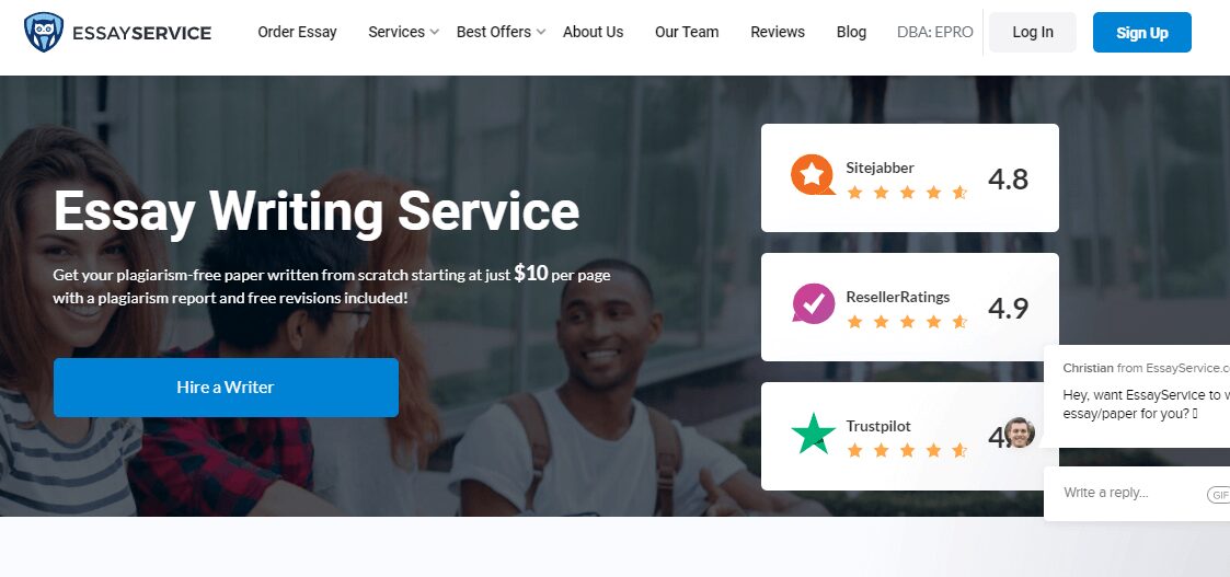 EssayService is another top-notch writing service on our list. It employs only the best writers, holders of Master’s and Ph.D. degrees, who are experts in their respective fields. You get to choose an author you would like to write your piece after you have placed an order and writers put bids on it. You can also talk to each expert before hiring them. The service also offers a variety of free features for students on a budget. If you choose to hire EssayService, you get the outline, the reference page, the title page, and the formatting and editing services for free.