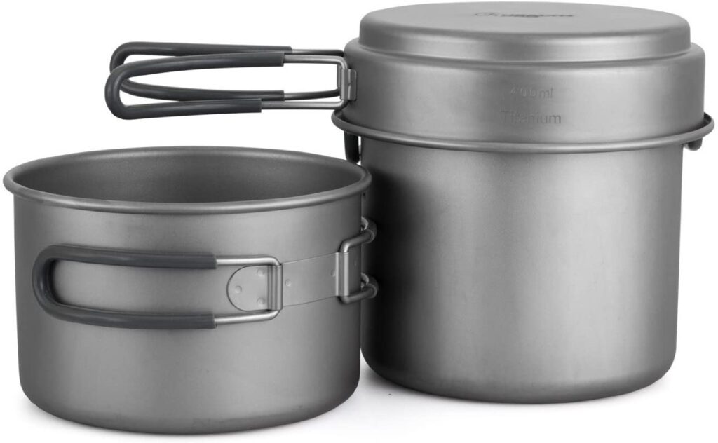 The HealthPro Titanium Lightweight 3-Piece Pot and Pan Camping Hiking Cookware Set is an excellent cookware set for the money and the overall rating of this cookware set is 4.6 out of 5 stars. Many customers rated this product for its dishwasher safe and lightweight design. Like we said before, we’ve tested many cookware sets and we like this cookware set more than other for its double boiler cooking. So, we would recommend this cookware set for those on a limited